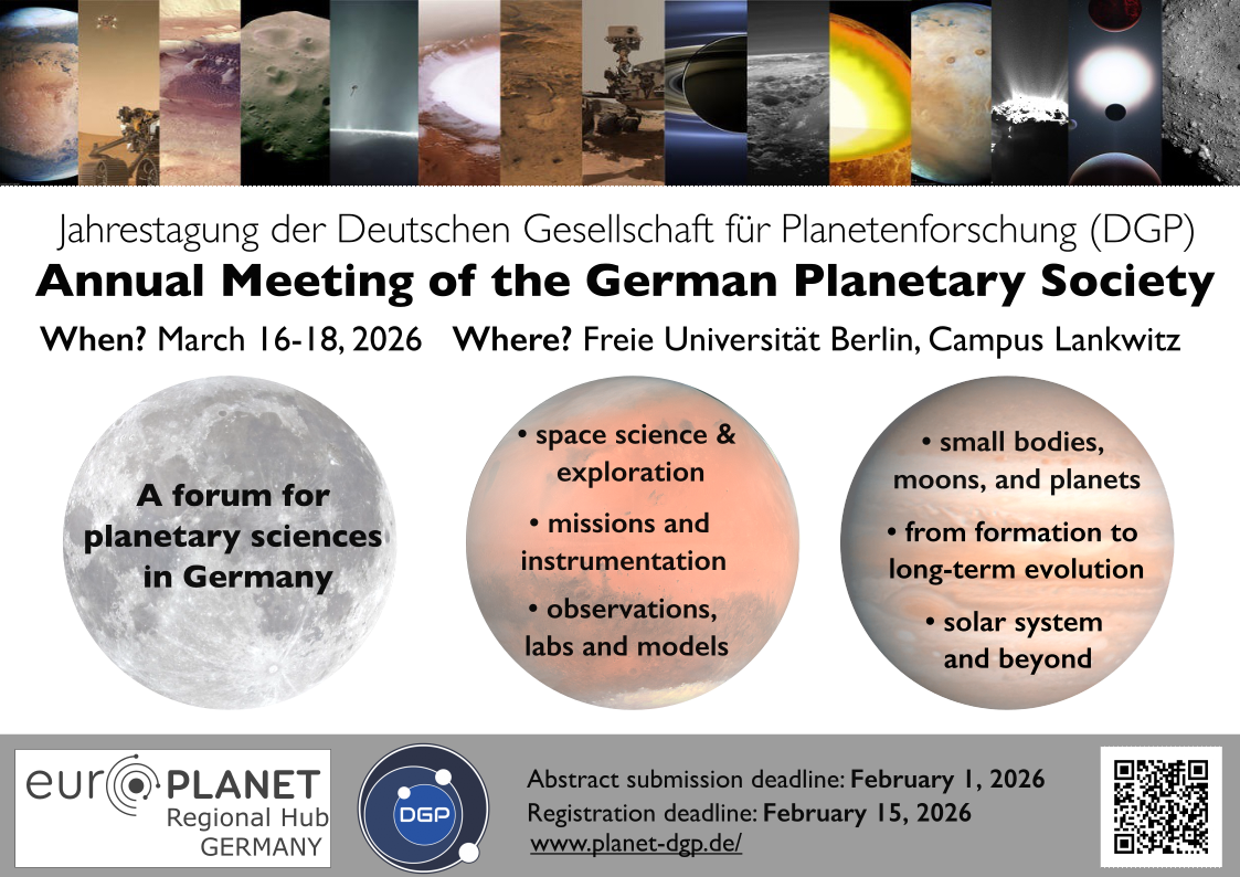 The recently founded German Society for Planetary Research (DGP) and the Europlanet Germany Regional Hub organise the first annual planetary science conference (DGP 2026) on 16-18 March 2026. The annual meeting will make activities in the field of planetary research in Germany more visible, promote scientific exchange, and strengthen cooperation between researchers, institutions, and companies.